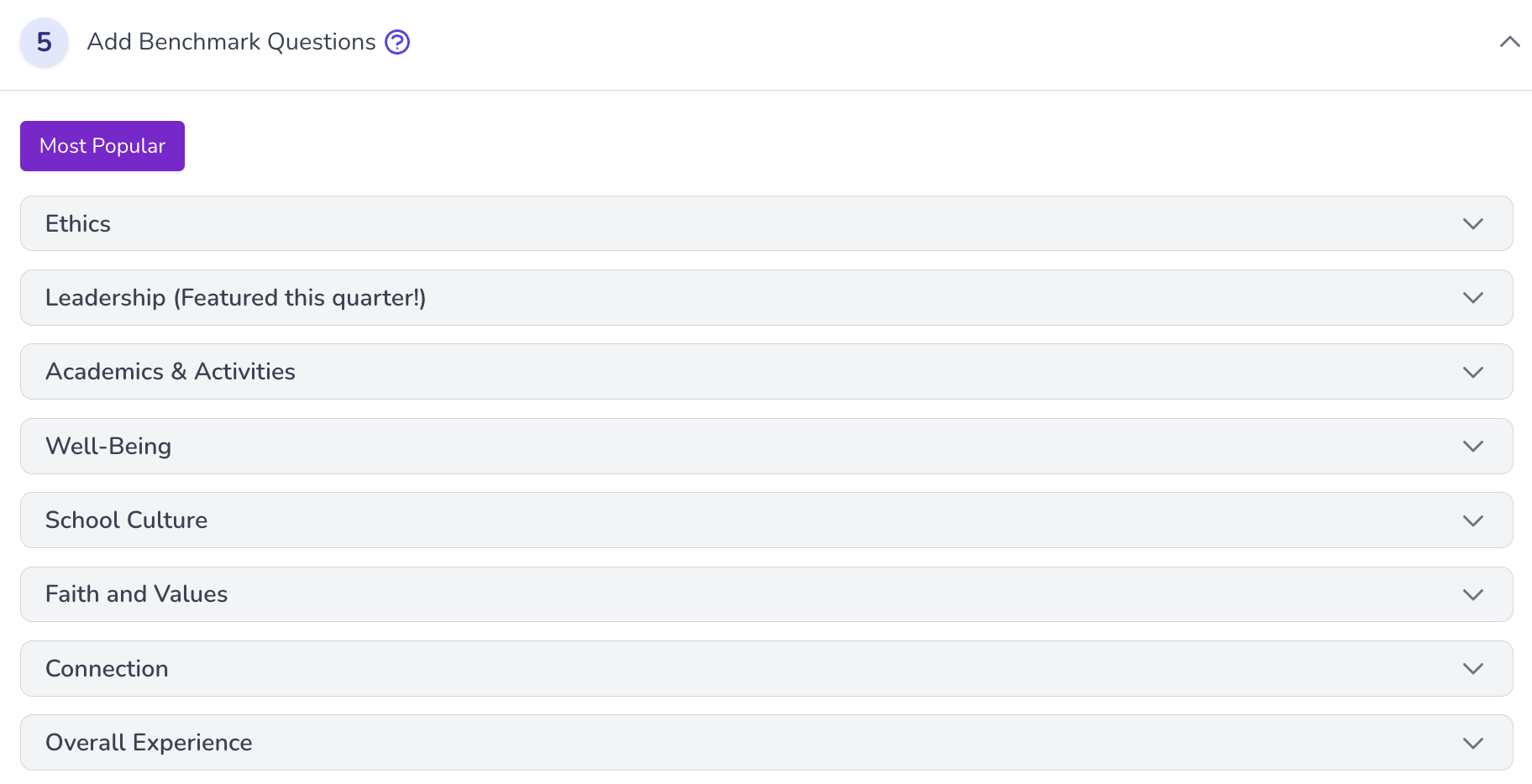 Next, you'll select benchmark questions from our various categories. We always suggest selecting a few questions that align with your school's core values or mission.